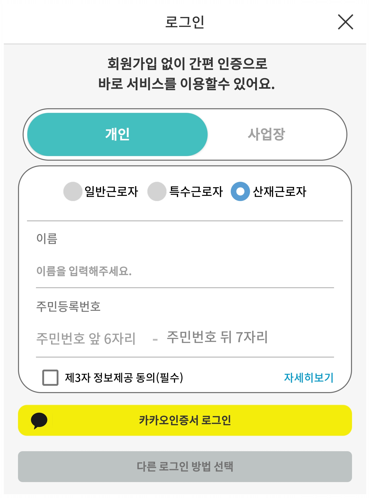 개인, 산재근로자 클릭 후 이름, 주민번호, 제3자 정보제공 동의 체크 후 카톡 로그인하면 된다.