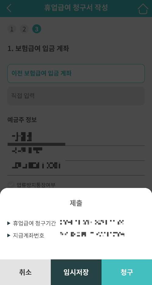 마지막으로 급여 신청하는 본인계좌 정보 및 청구 기간을 확인하면 끝.
