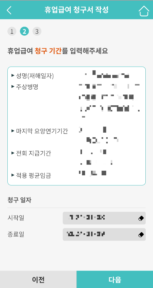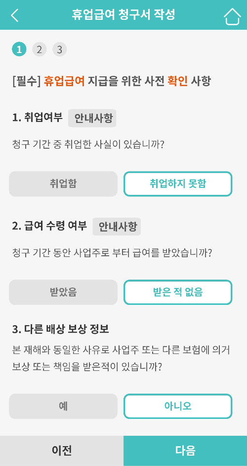 2. 급여 수령여부 : 청구기간 중 사업주로부터 급여를 받았는지 확인하는 건데 대부분이 받은 적 없음 일 것이다.