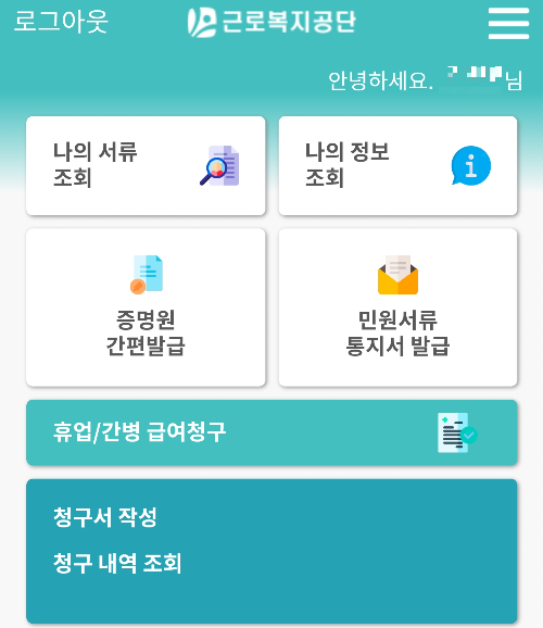 로그인했으면 휴업/간병급여 청구 → 청구서 작성 터치