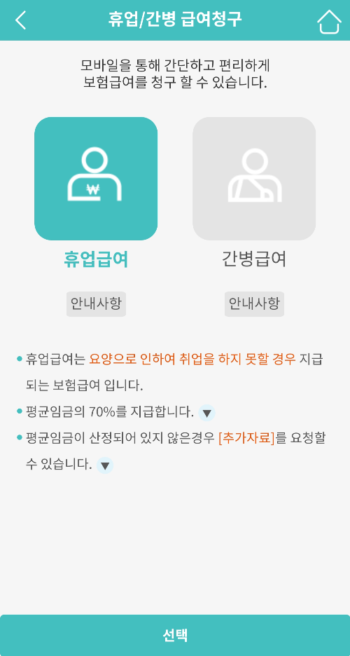 휴업/간병 급여청구 → 휴업급여 터치 후 선택 터치